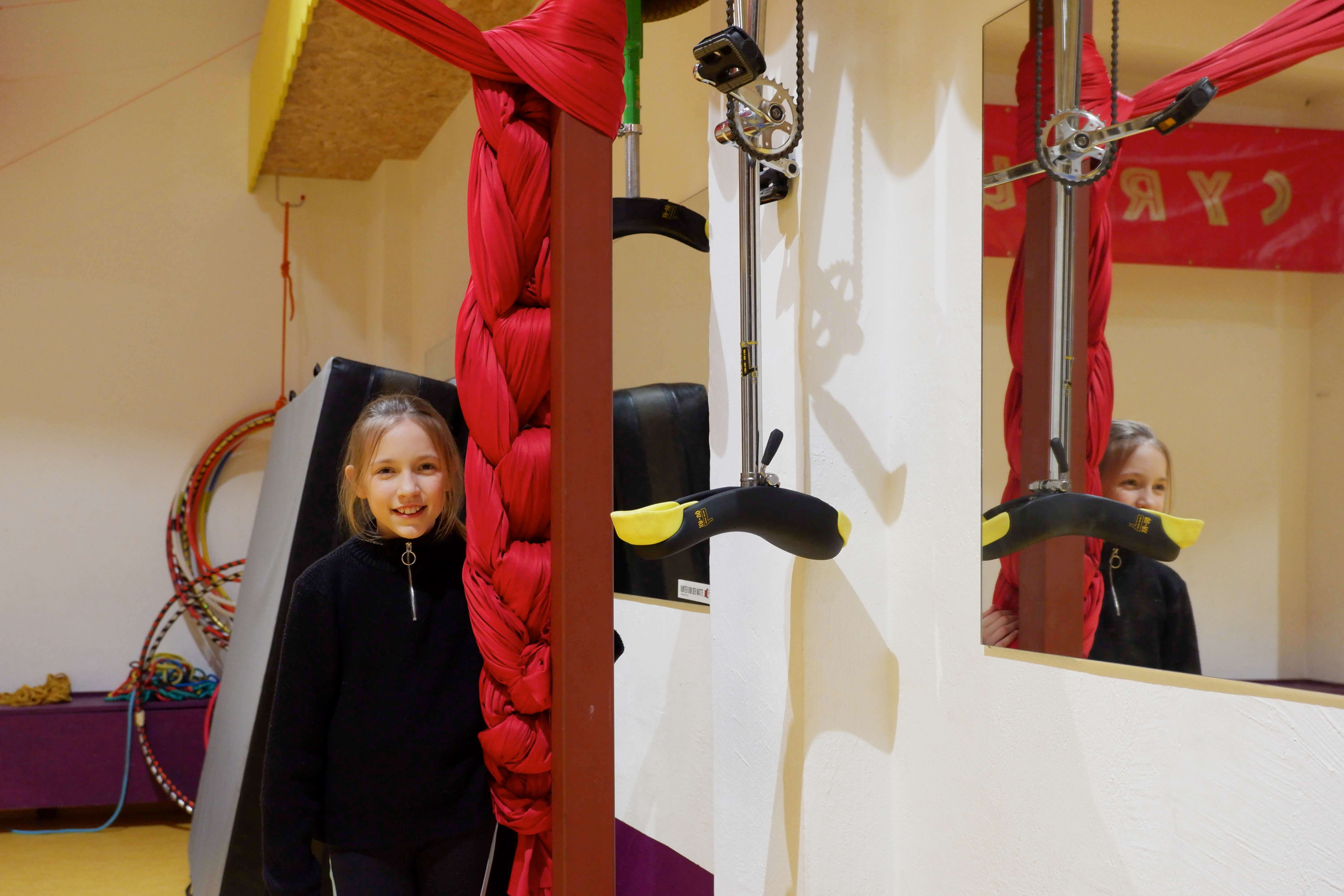 Olga (10 Jahre) aus Zgorzelec ist eine unser erfahreneren CYRKUS-Artistinnen. Sie trainiert in dieser Ladensaison an hängenden Tüchern Luftakrobatik. Auch sie hat, inspiriert durch ihre ältere Schwester, mit dem Angebot für Jüngere begonnen und auch schon Einrad und Jonglage probiert. “Ich komme gern in den CYRKUS-Laden. Es macht mir viel Freude und ich habe hier Freunde aus beiden Städten”, sagt sie. So wie die beiden, gibt es inzwischen viele begeisterte Teilnehmende. Unser CYRKUS-Laden öffnet seine Türen aber nicht nur für Kinder und Jugendliche: Beim Baby-CYRKUS, einem Angebot für Eltern mit Kindern von 0 bis 3 Jahren, steht das gemeinsame Bewegen, Erforschen und Spielen im Vordergrund.