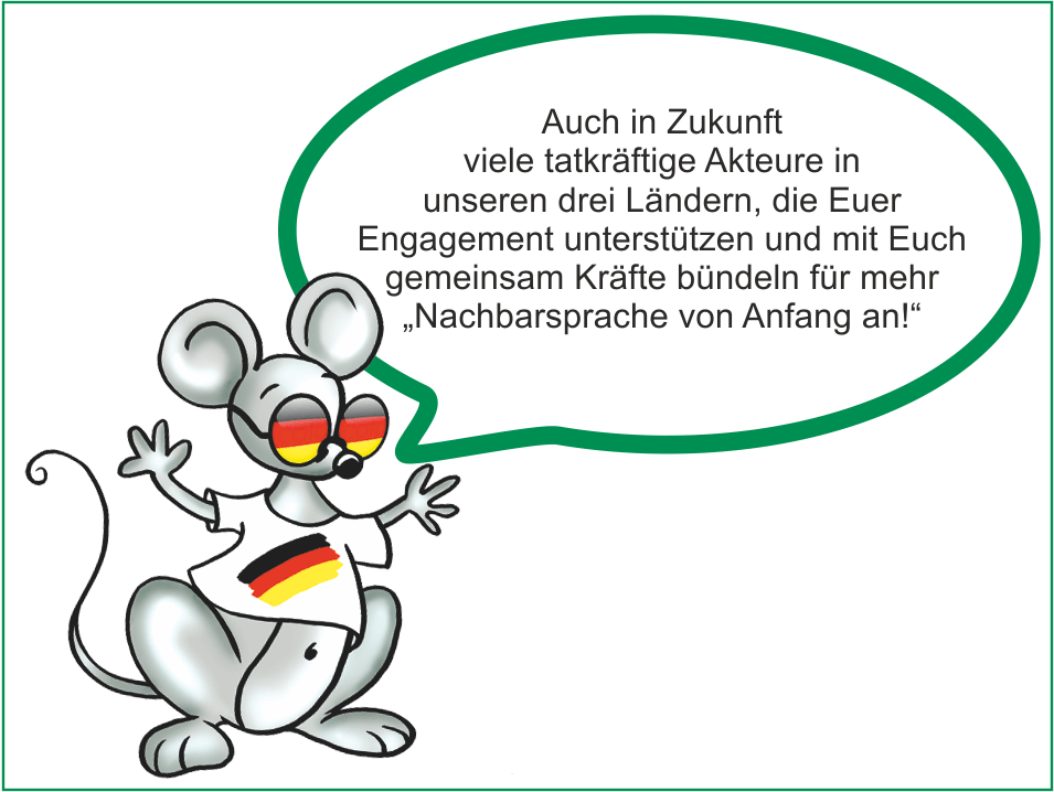 Wir drei wollen Euch, liebes LaNa-Team, unbedingt noch lange auf dem Weg zur Nachbarsprache von Anfang an! in Sachsens Grenzregionen begleiten und in immer mehr Kitas entlang der sächsisch-polnisch-tschechischen Grenze als fröhliche Botschafter dafür Einzug halten und mit den Kindern viele schöne Abenteuer erleben. Wir sind schon gespannt und freuen uns auf die nächsten gemeinsamen Jahre!
