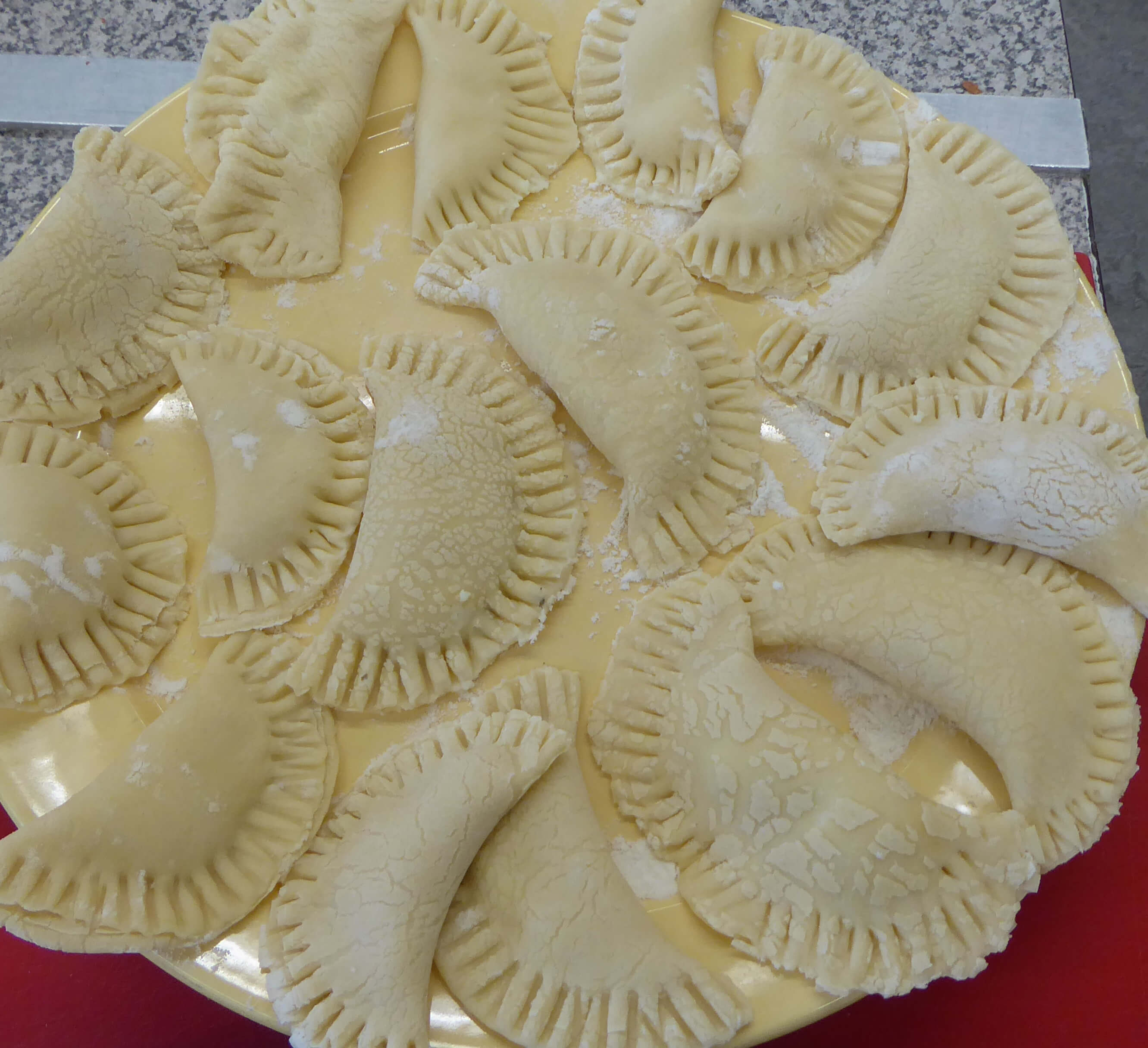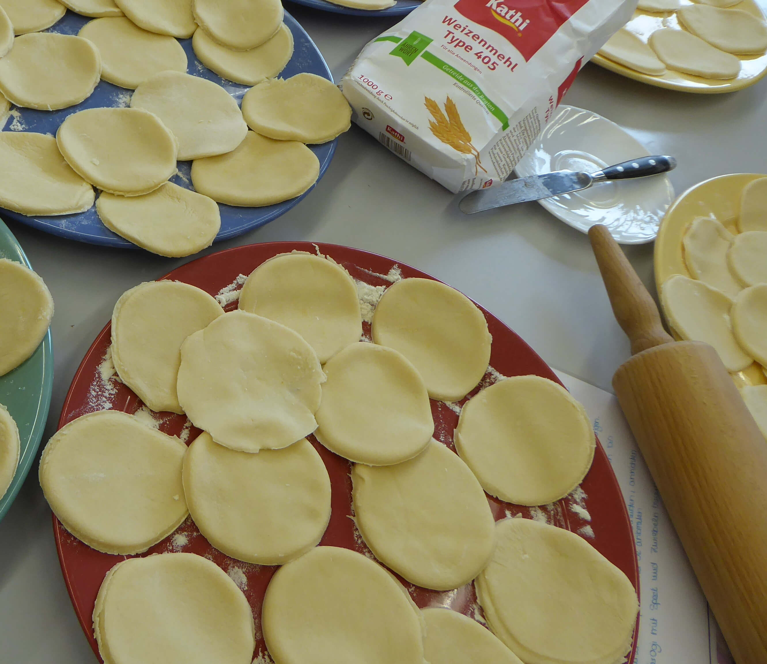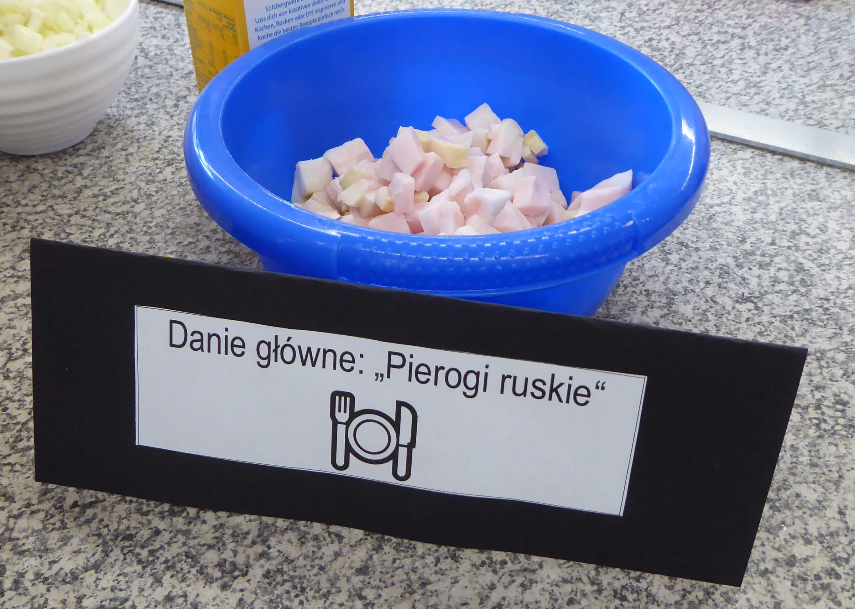 Nach dieser Einstimmung auf das Thema begann der praktische Teil, die Zubereitung der ausgewählten Rezepte. Aufgeteilt in Gruppen wurde ein 4-Gänge-Menü vorbereitet. Und natürlich durfte dabei der Klassiker Pierogi ruskie (Russische Piroggen) nicht fehlen. Für den süßen Abschluss des Menüs wurde eine Tortowy zając (Hasentorte) kreiert.