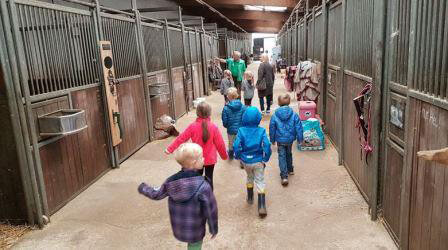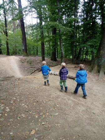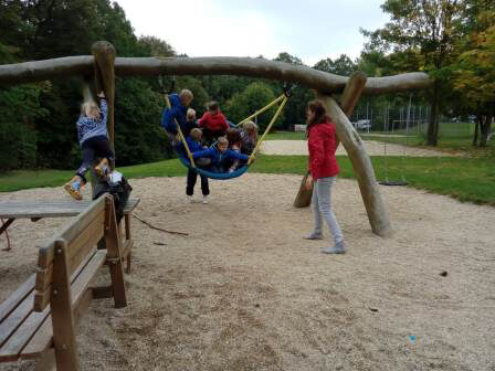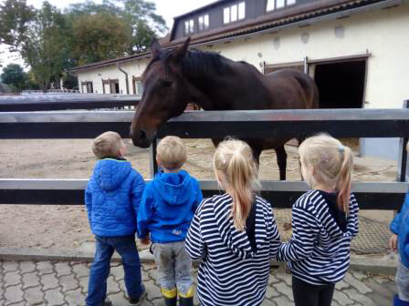 Eliza und Ilona luden anschließend ihre Freunde ein, auch ihre Wohnumgebung kennenzulernen. So wurde durch das angrenzende Waldgebiet spaziert und getobt und der Rosenhof, eine Pferde- und Freizeitanlage besucht. Eliza und Ilona waren hoch engagiert und nahmen Kinder und Erzieherin wunderbar in ihre Lebenswelt mit hinein. Der Nachmittag war so schön, dass keiner an ein Ende dachte. Zum Abschluss trafen sich alle „Ausflügler“ noch einmal auf dem Spielplatz vor dem Haus und die Stimmung war gefüllt mit Lachen, polnischen und deutschen Worten und natürlich konnte man immer wieder das polnische Lied* hören.