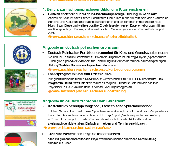 Letzte Woche hat die LaNa aktuelle Informationen rund um Nachbarsprache von Anfang an! veröffentlicht und an Kindertagesstätten in den sächsischen Euroregionen per Mail versendet. Darüber hinaus steht die erste Ausgabe des Kita-Info-Briefes 2026 in der Materialbibliothek der LaNa online zum Download zur Verfügung. Nutzen Sie die Informationen gern als Aushang in Ihren Einrichtungen! So sind Sie als Kita-Leitungen, Ihre Teams und die Familien Ihrer betreuten Kinder gemeinsam informiert und auf dem Laufenden rund um die frühe nachbarsprachige Bildung ab der Kita.